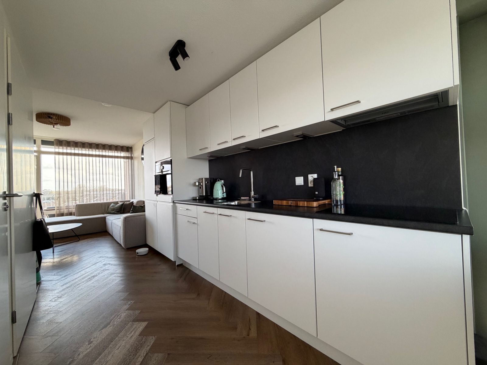 Bij binnenkomst stap je direct de keuken binnen, waar voldoende ruimte is voor het plaatsen van een eettafel. De keuken is voorzien van hedendaagse gemakken, zoals een inductiekookplaat, koelkast en afzuigkap. Tegenover de keuken bevindt zich de badkamer en in het verlengde van de keuken bereik je de woonkamer. Vanuit de woonkamer heb je toegang tot het balkon, wat zorgt voor een prettige buitenruimte. Daarnaast is er een praktische bergingskast aanwezig met aansluiting voor een wasmachine.