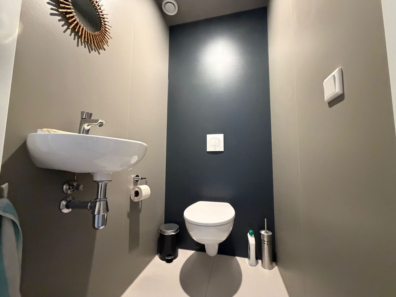 Via de hal bereik je het separate toilet en de trap naar de bovenverdieping. Hier bevindt zich de ruime slaapkamer met aansluitend de nette badkamer, voorzien van een wastafel, royale douchecabine en een designradiator. Daarnaast zijn er twee praktische bergingen aanwezig, met onder andere ruimte voor een wasmachine.