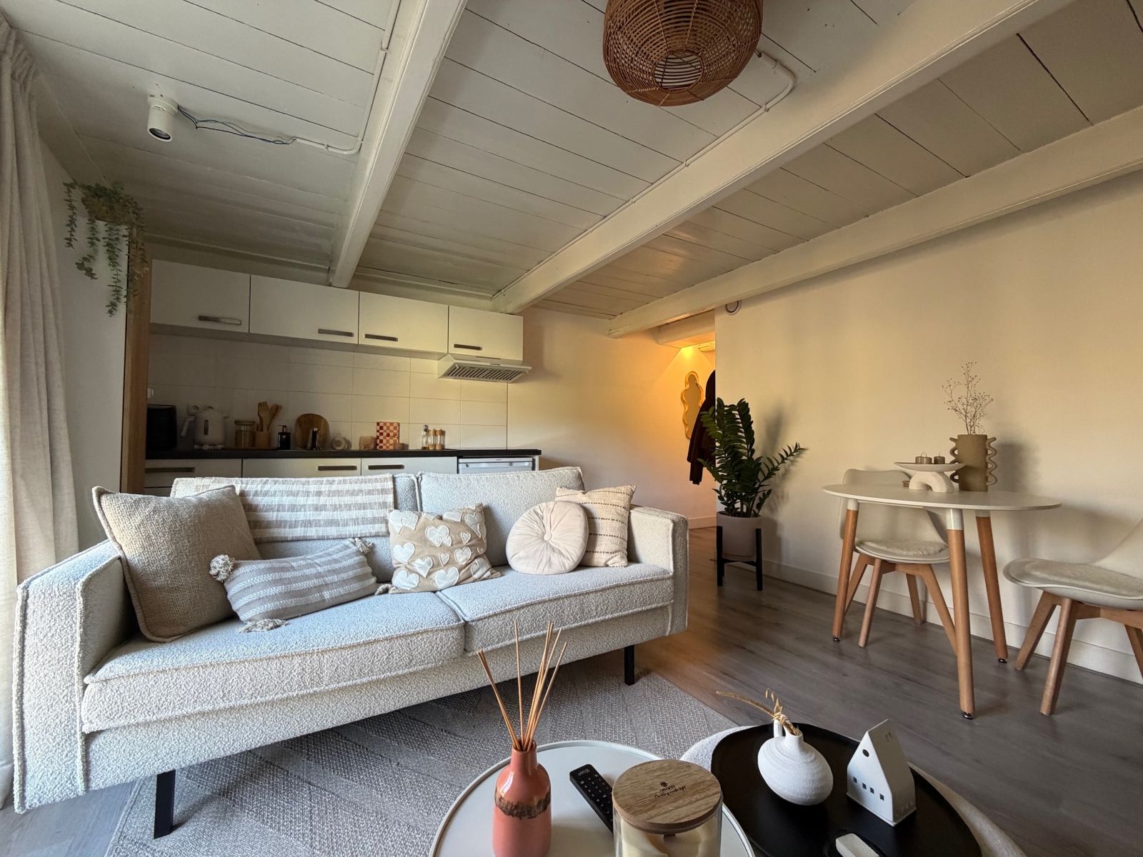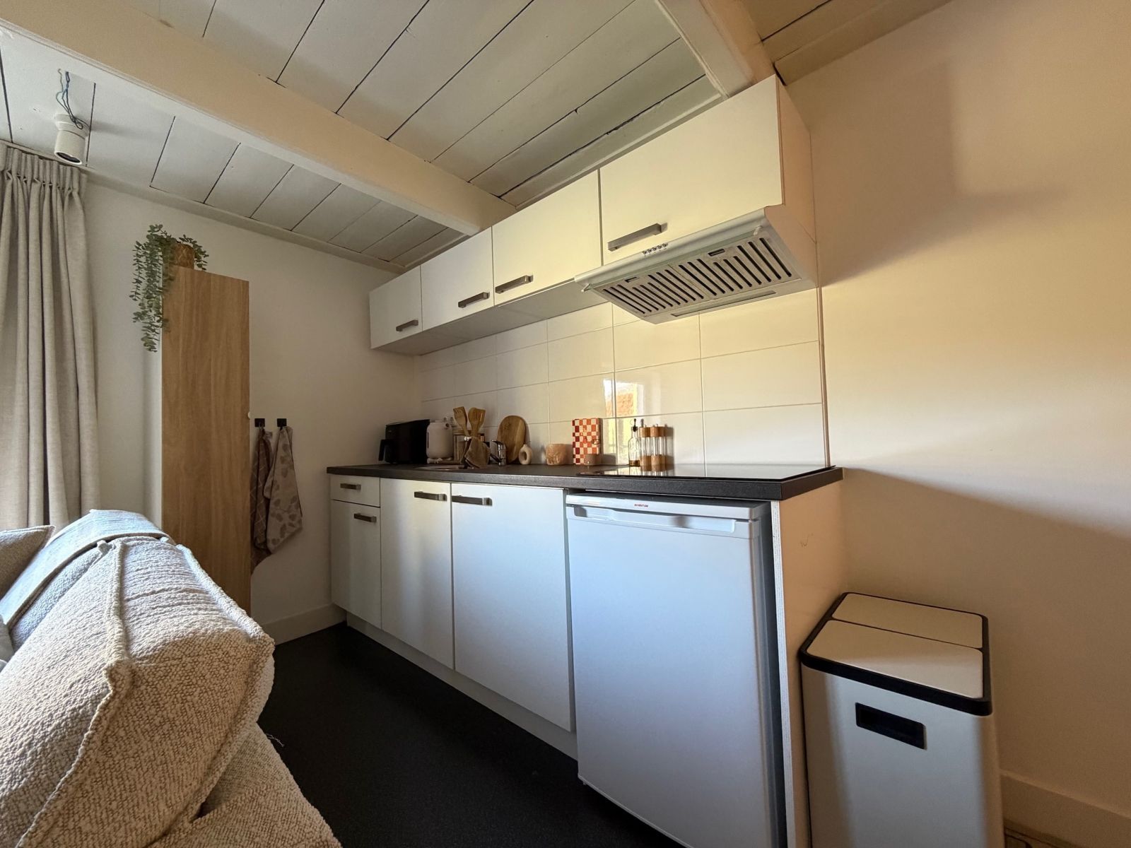 De keuken is uitgerust met een kookplaat, afzuigkap en een koel-vriescombinatie. Via de trap betreed je de slaapkamer.